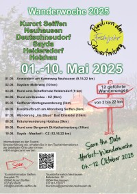 Alle Termin zu den Wanderwochen in Kurort Seiffen, Deutschnudorf, Heidersdorf, Neuhausen, Holzhau, Cämmerswalde, Sayda und Dorfchemnitz vom 01. bis zum 10. Mai 2025 finden Sie hier im PDF Download Flyer LINK!